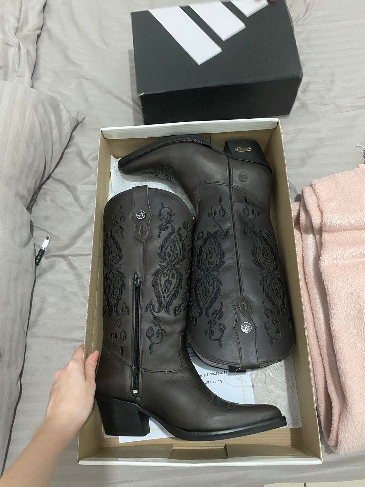 Texana Feminina em Couro Legítimo na cor Fóssil Cinza, uma Bota super estilosa, com alto conforto, qualidade e durabilidade. Tem detalhes Bordados no cano.