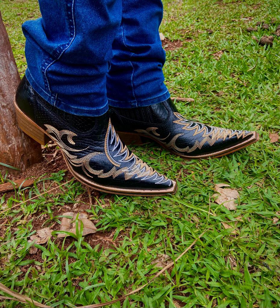 Botina Country Masculina Bico Fino Couro Legítimo Bovino Anaconda Preta com Bordado